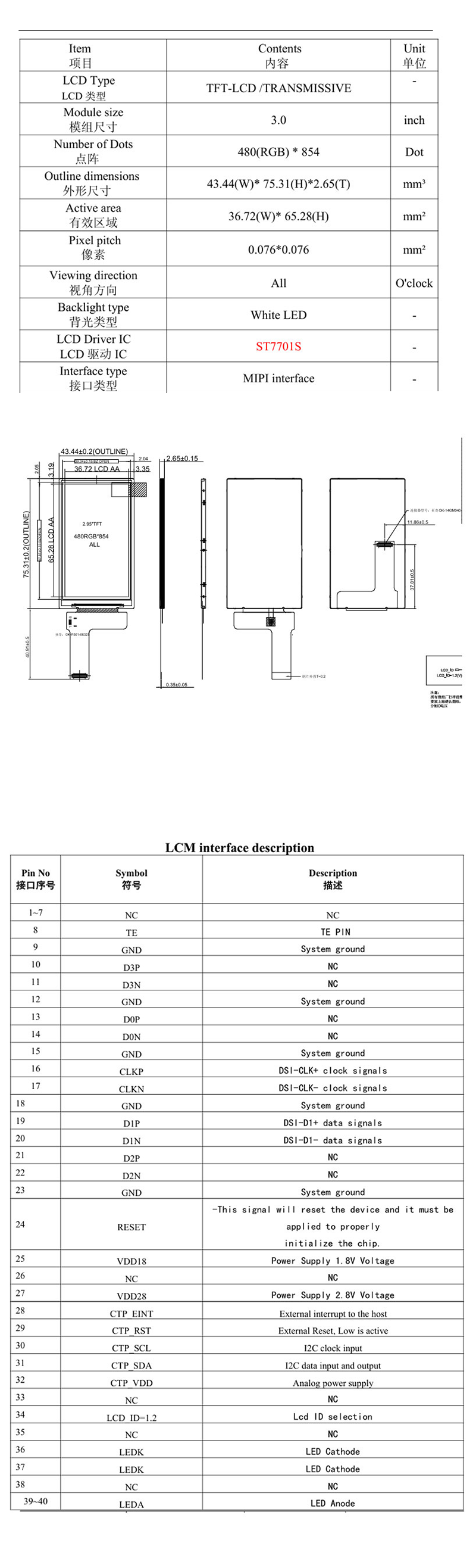 | 关键描述: | 3寸480*854tft长条屏mipi接口40PIN 厂家定制排线多点触摸FT6336U |