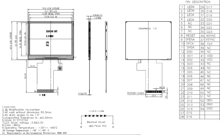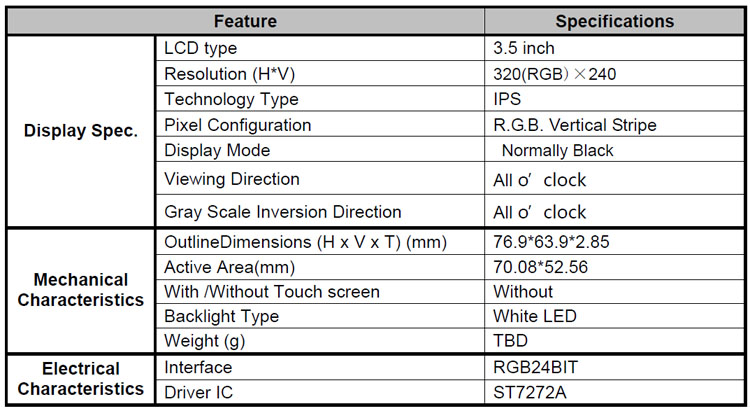 | 关键描述: | 宇锡3.5寸横屏液晶显示模组, 320x240, 350亮度, 54pins, RGB接口, ST7272, 横屏全视角LCD显示屏 |