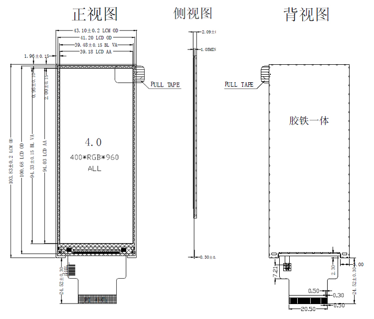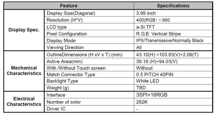| 关键描述: | 宇锡4.0寸长条形液晶显示模组, 400x960, 420亮度, 40pins, SPI+RGB接口, 长条竖屏全视角显示屏 |