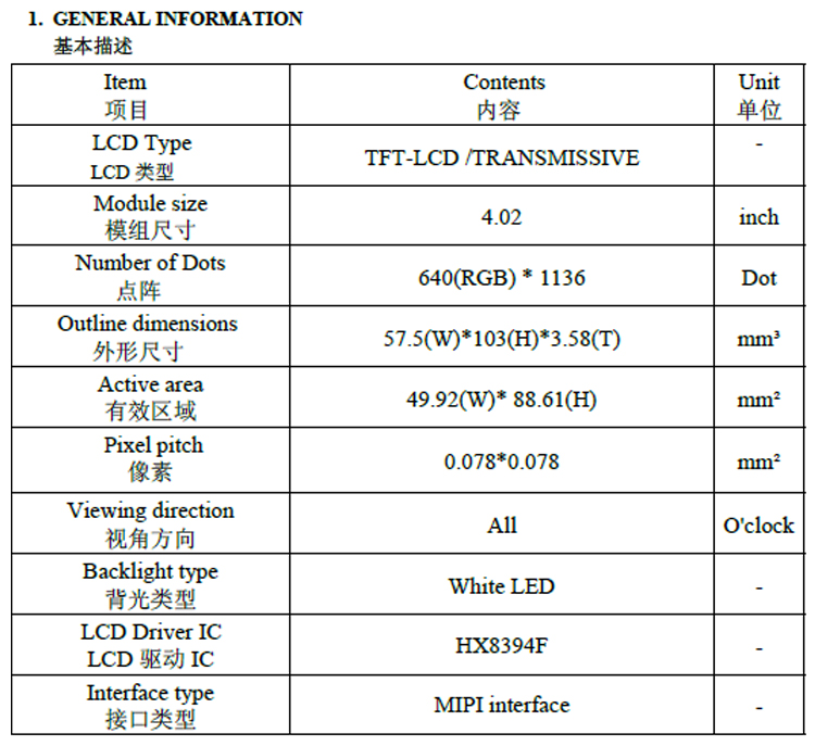 | 关键描述: | 宇锡4.02寸竖屏液晶显示模组 640x1136 MIPI接口 IPS视角 TFT LCD HD触摸高亮显示屏 |