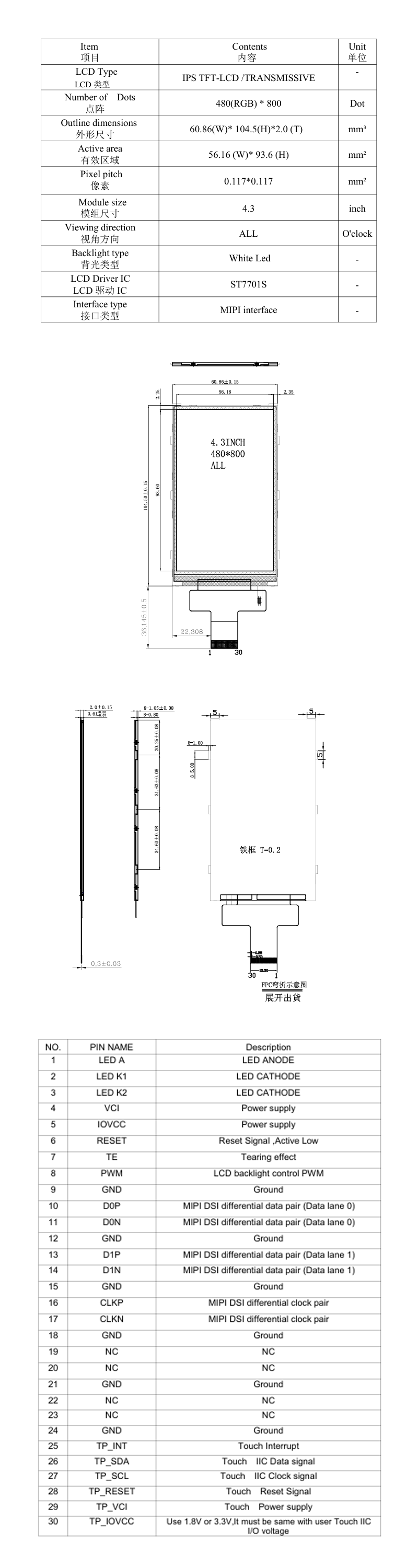 | 关键描述: | 4.3寸480X800LCM触摸屏工控仪表屏MIPI接口30pin4通道ST7701S |