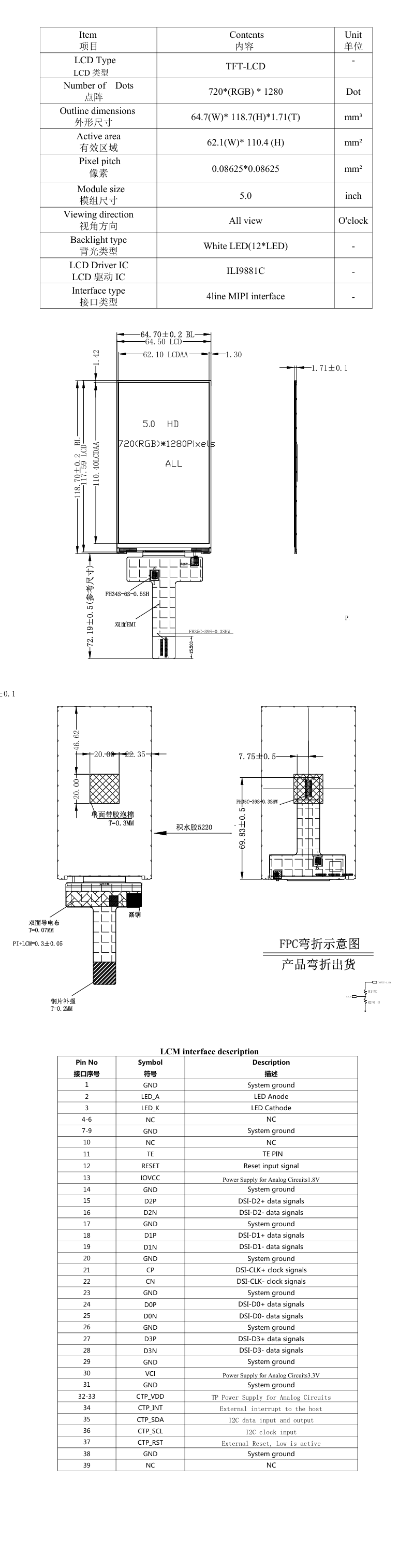 | 关键描述: | 宇锡5寸720*1280 MIPI4通道IPS液晶模组tft彩色触摸屏HD高亮度700 |