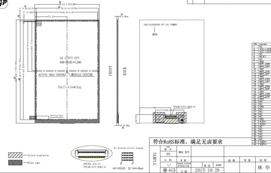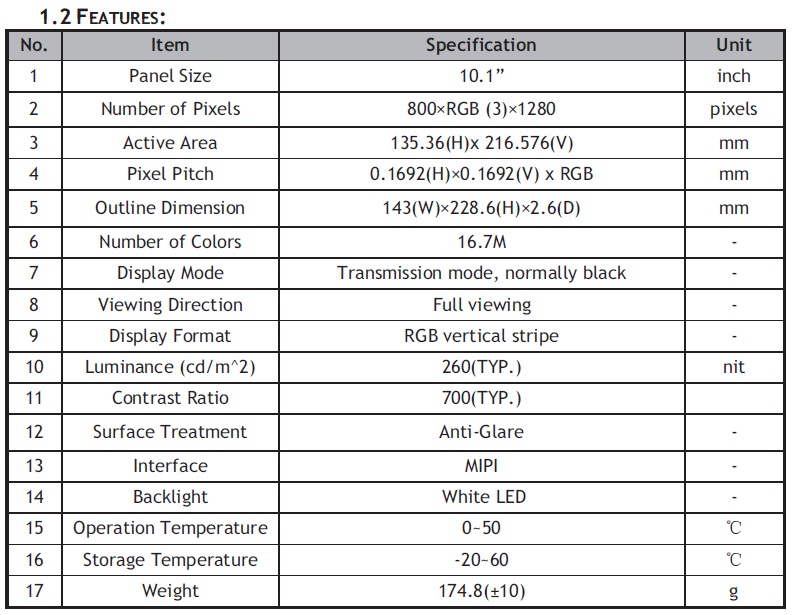 | 关键描述: | 10.1寸, 800*1280, 260亮度, 40pin, MIPI I/F, IPS模组 |