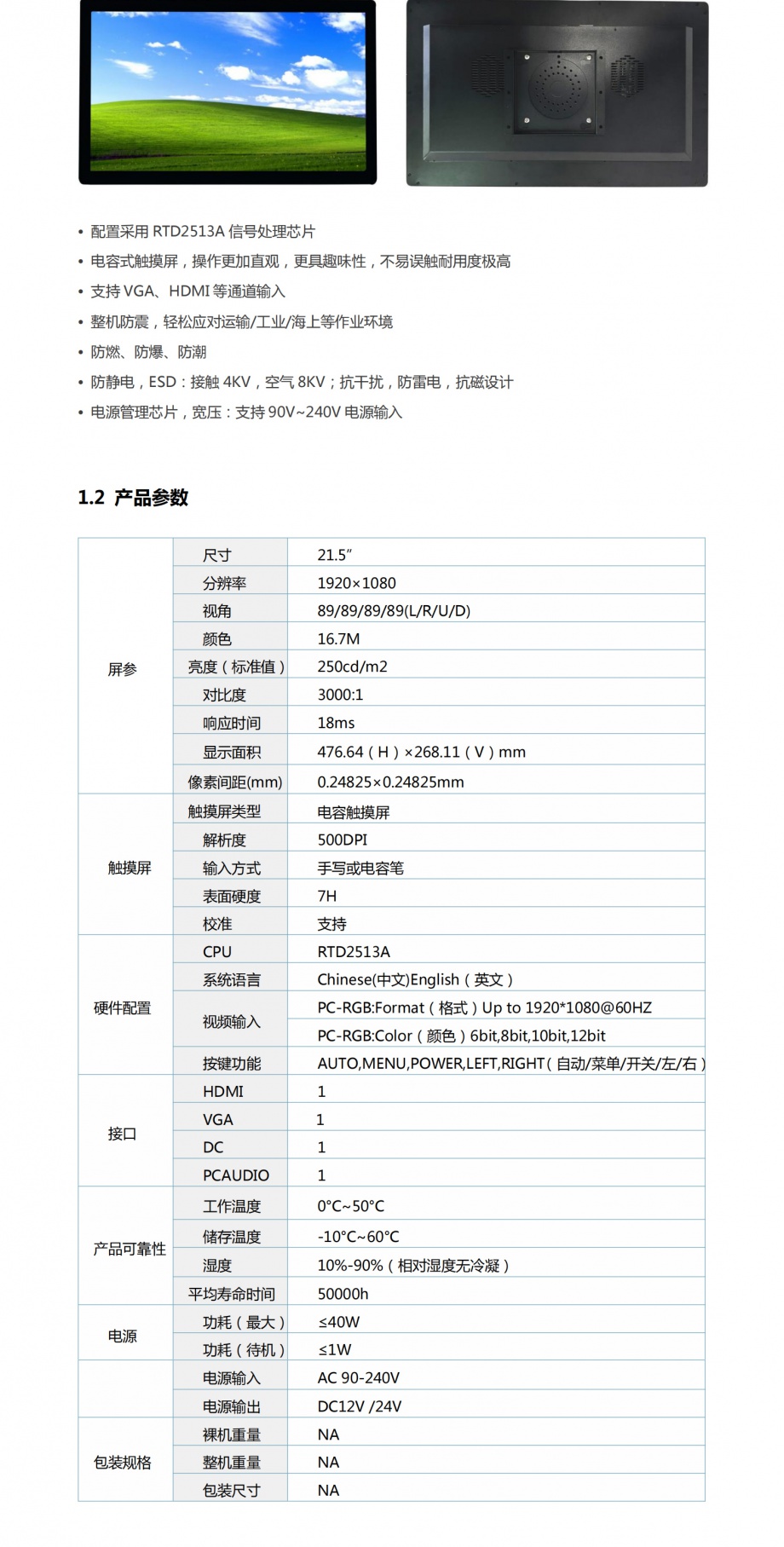 | 关键描述: | 21.5寸电容式触摸屏 安卓X86工业工控一体机嵌入式温压抗干扰电容触控平板触摸屏显示器 1920×1080 250cd/m² |