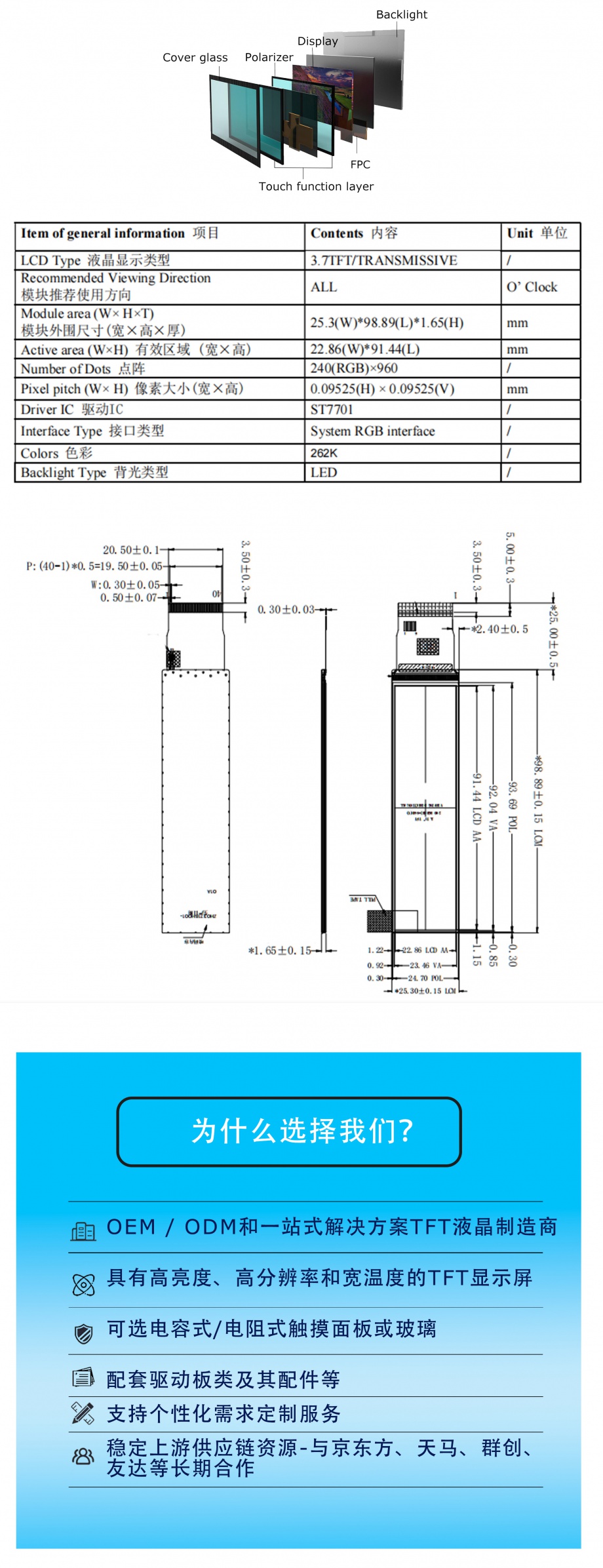 | 关键描述: | 3.71寸TFT液晶显示屏 240*960 350亮度 IPS液晶屏 40PINS RGB 宽温屏 |