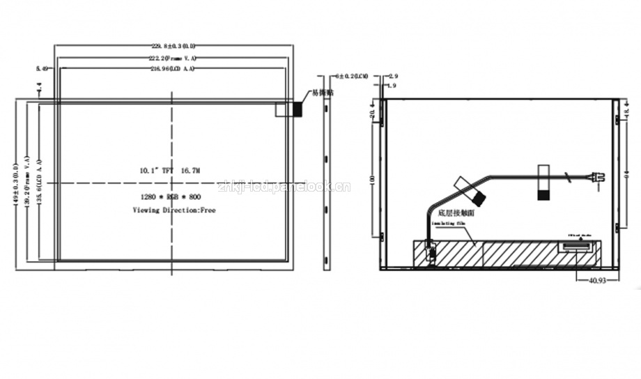 ZH101HH058-02B是一种利用非晶薄膜晶体管(TFT)作为开关器件的透射式彩色有源矩阵液晶显示器(LCD)。该产品由TFT LCD面板、驱动IC、PCB和WLED背光单元组成。活动显示面积为10.1英寸对角线测量,本机分辨率为1280*RGB*800,pin脚数为40。